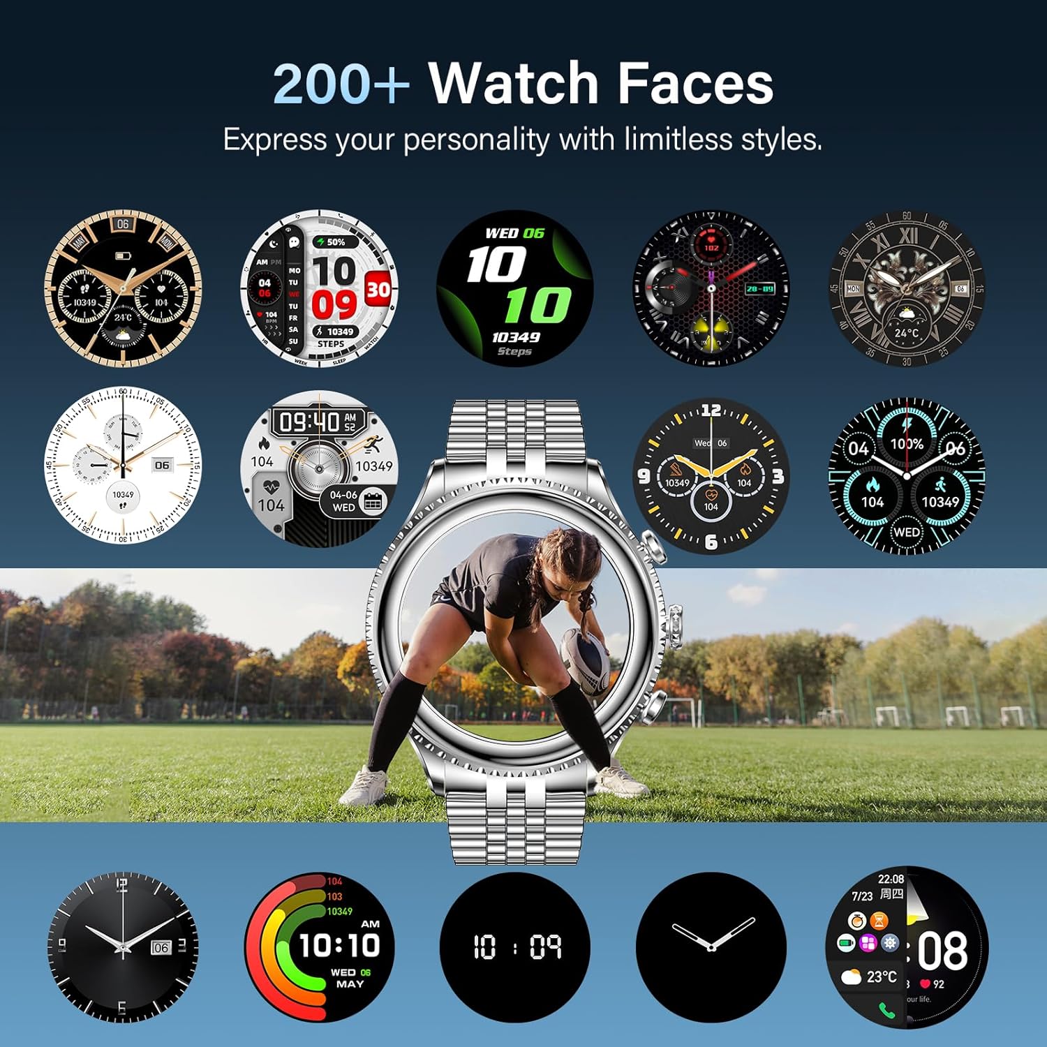 【Bluetooth Calling, Voice Assistant, and Notifications】Stay connected anytime anywhere with true sync Bluetooth calling. Built-in microphone and high-fidelity speaker enable clear calls, call log management, and contact synchronization. Receive real-time notifications from SMS, Facebook, WhatsApp, Twitter, Instagram, Messenger, and more, ensuring you never miss important alerts.