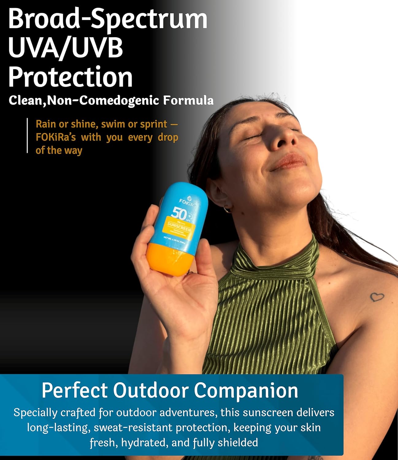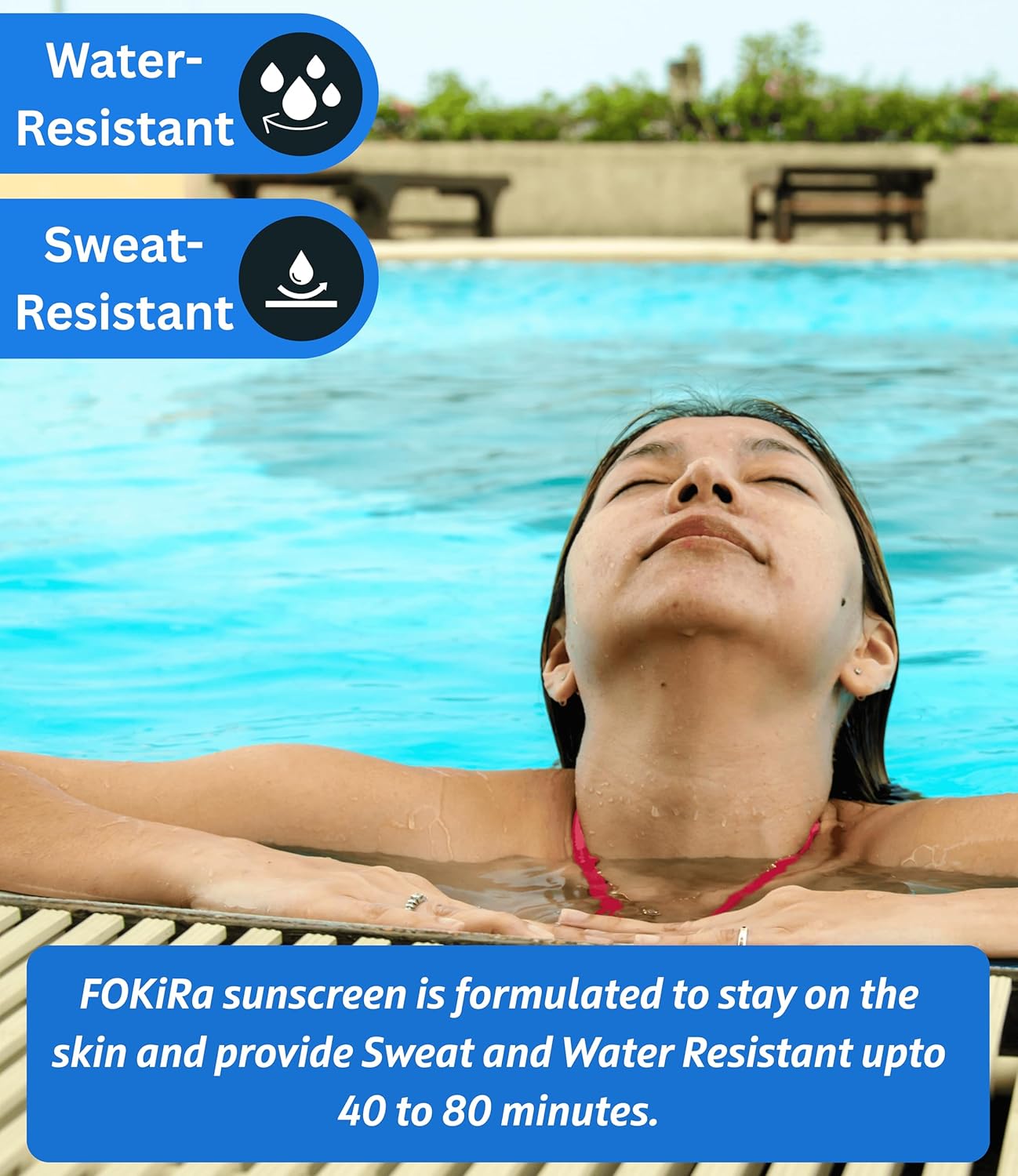 โ๐๐๐ฉ๐๐ง-๐๐๐จ๐๐จ๐ฉ๐๐ฃ๐ฉโ FOKiRa Sunscreen Lotion is designed to maintain its SPF protection for a specified duration (40 to 80 minutes) while exposed to water or sweat, requiring reapplication afterward to maintain effectiveness. What it means: “Water-resistant” means the FOKiRa sunscreen is formulated to stay on the skin and provide UV protection upto 40 to 80 minutes.