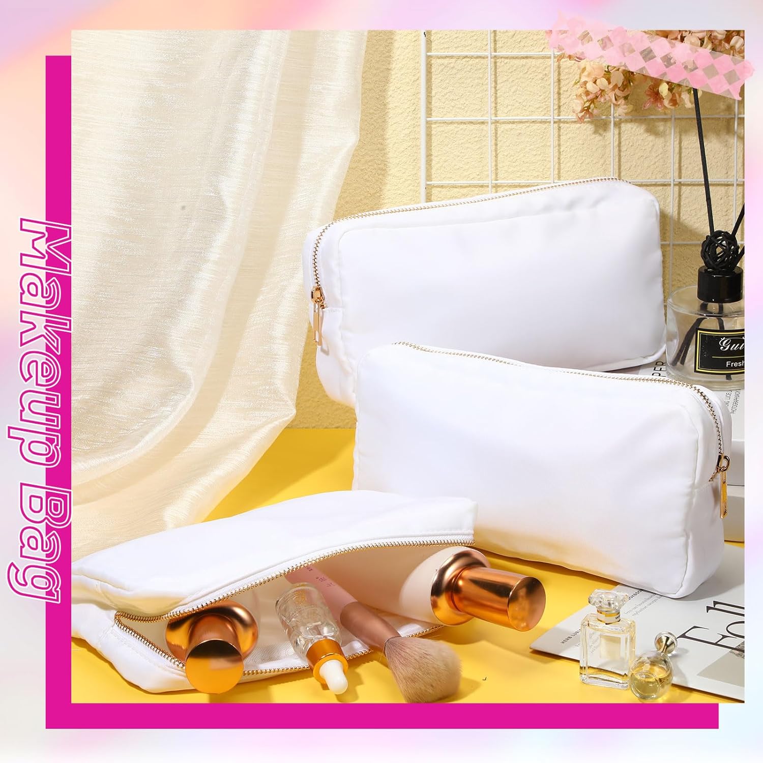 Waterproof Material: these makeup pouch are made of waterproof nylon material, odorless and reliable, stylish, waterproof fabric and easy to wipe, you can also DIY the way you want, the lining is made of thick sponge and back lining, can be more convenient for your journey; Please check the waterproof performance before using