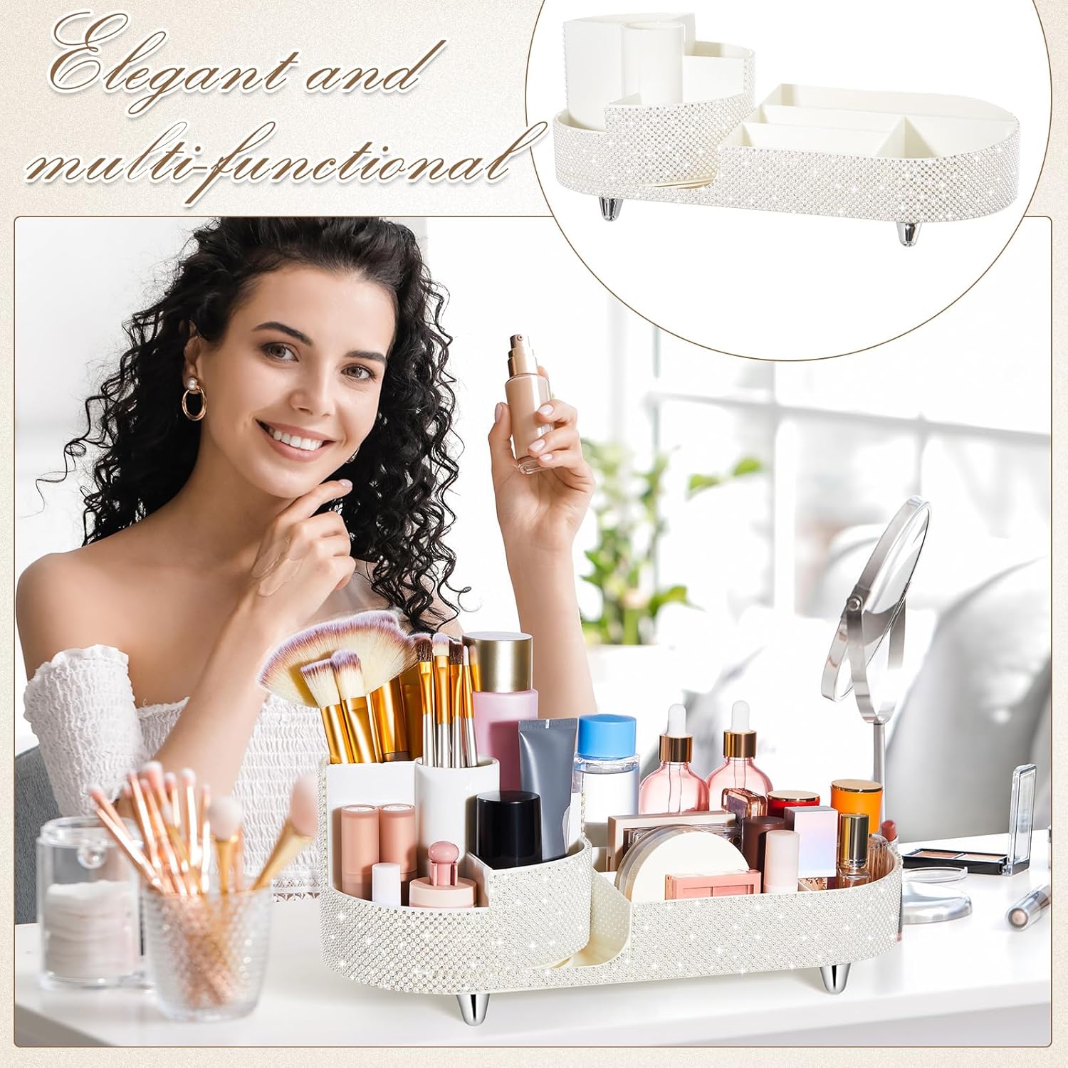 Elegant and Multifunctional: the rhinestone adorned makeup organizer offers two distinct zones for storage; The left side features a 360 degree rotating rack with five compartments, while the right side has a detachable organizer box; This suitable combination ensures that your cosmetics are neatly stored, saying goodbye to cluttered drawers and vanities