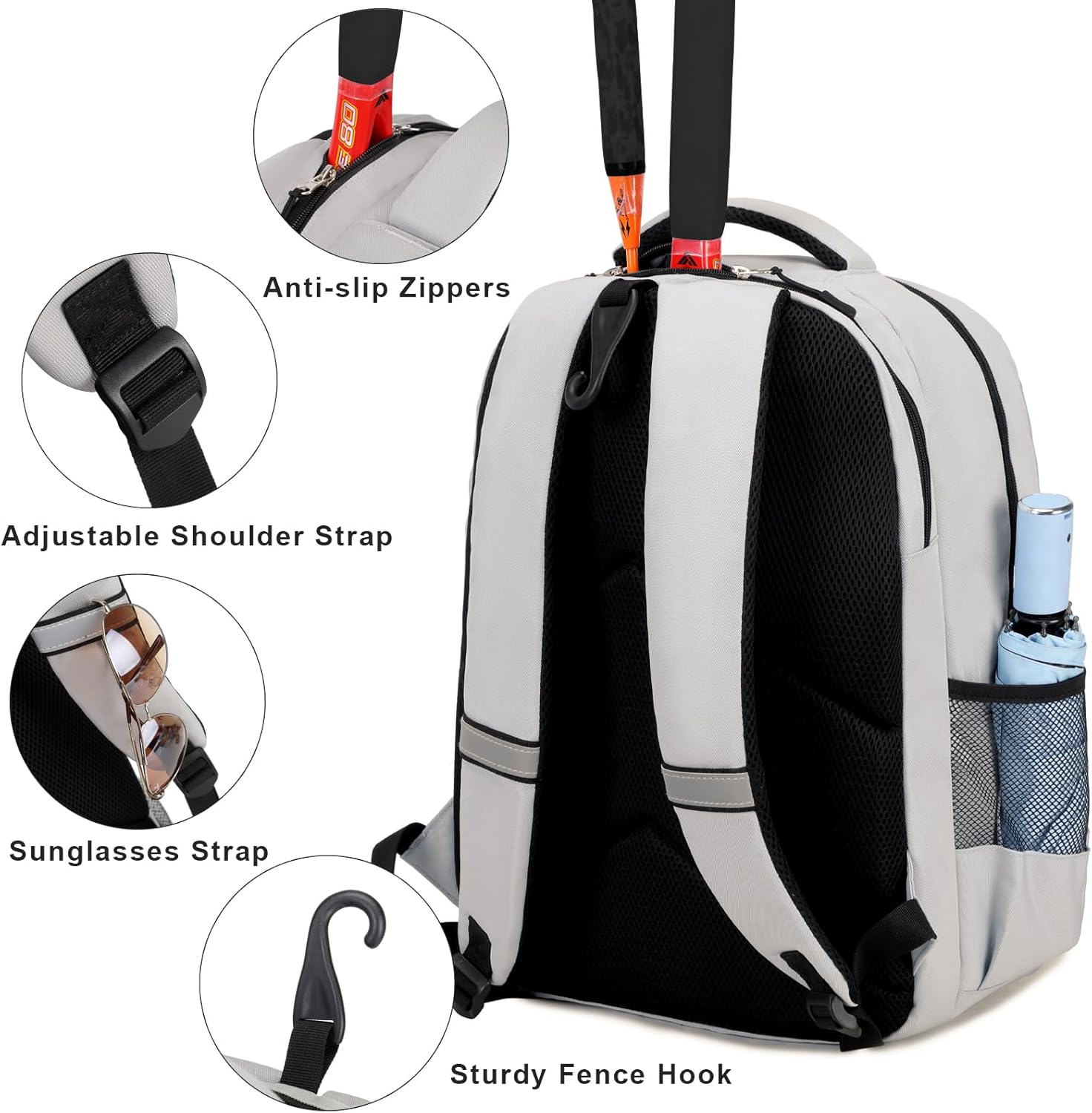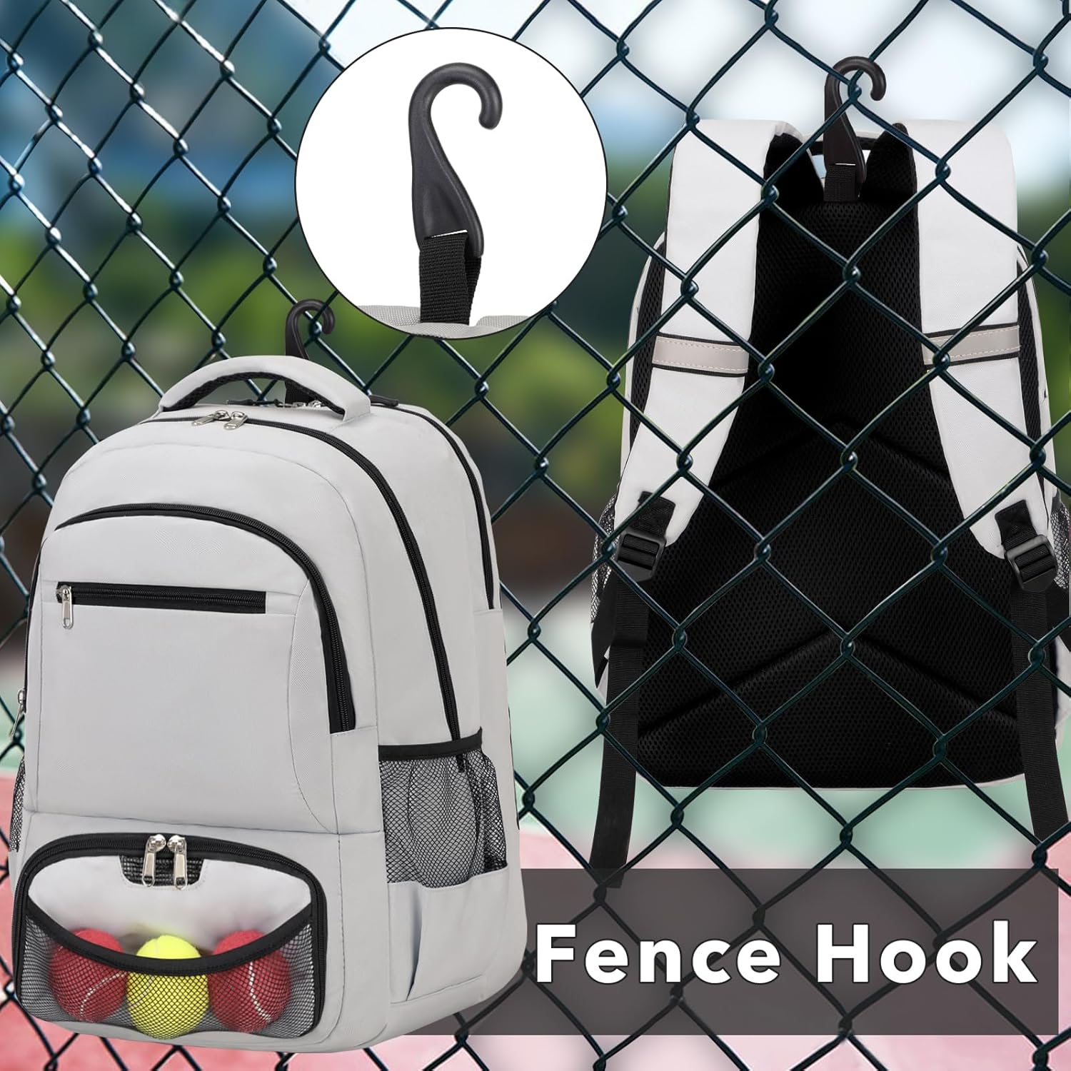 【User-Friendly】The racket compartment of this tennis bag features a padded divider shaped to cradle and safeguard rackets individually. The dual anti-slip zippers effectively anchor the tennis rackets in position. Moreover, this tennis racket backpack includes a handy fence hook for easy net hanging, while the shoulder straps feature reflective belts to fix your sunglasses or hat.