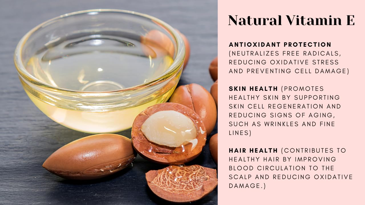 Vitamin E: Antioxidant Protection (Neutralizes free radicals, reducing oxidative stress and preventing cell damage); Skin Health (Promotes healthy skin by supporting skin cell regeneration and reducing signs of aging, such as wrinkles and fine lines); Hair Health (Contributes to healthy hair by improving blood circulation to the scalp and reducing oxidative damage.)