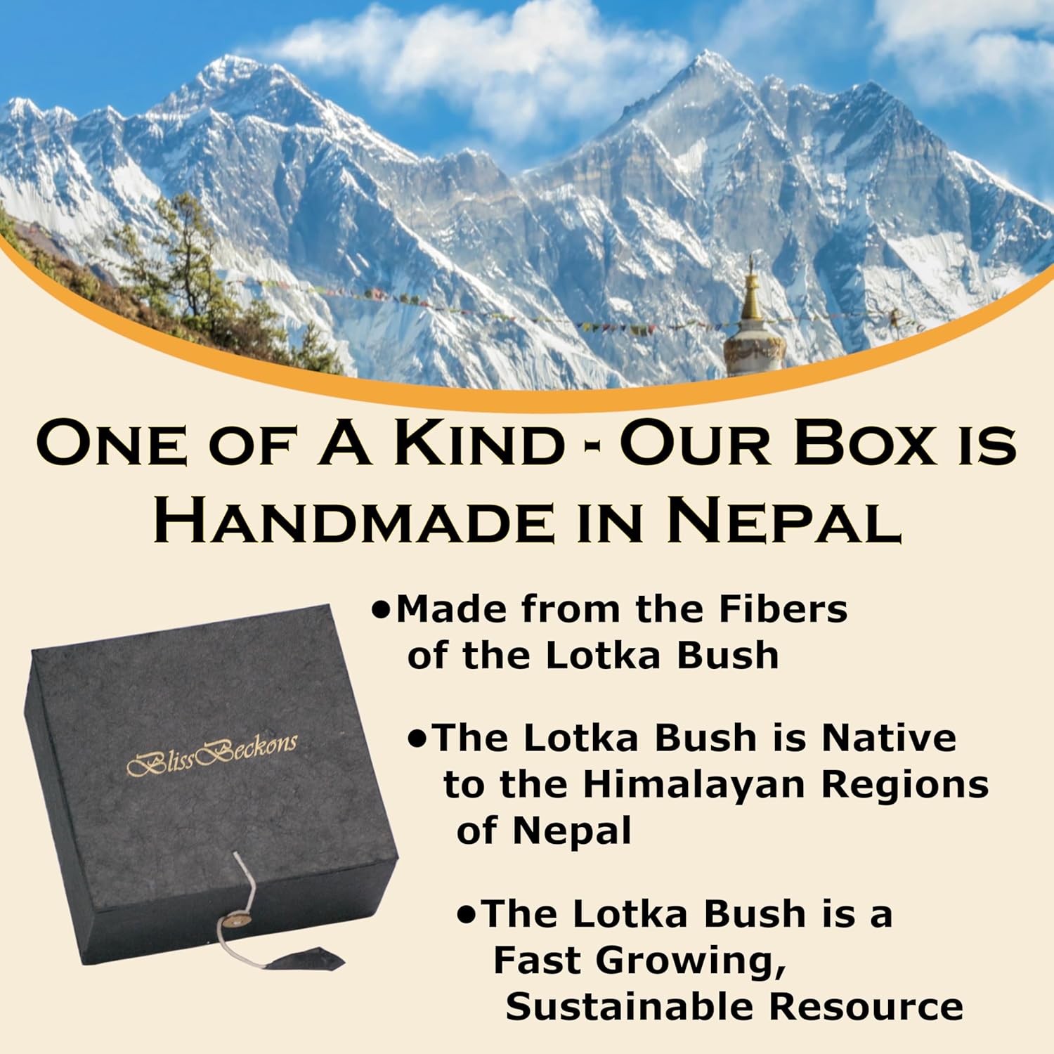 CONTENTS – 4.5 inch Tibetan singing bowl, felt tipped mallet, and singing bowl cushion, in a handcrafted gift-ready lokta box