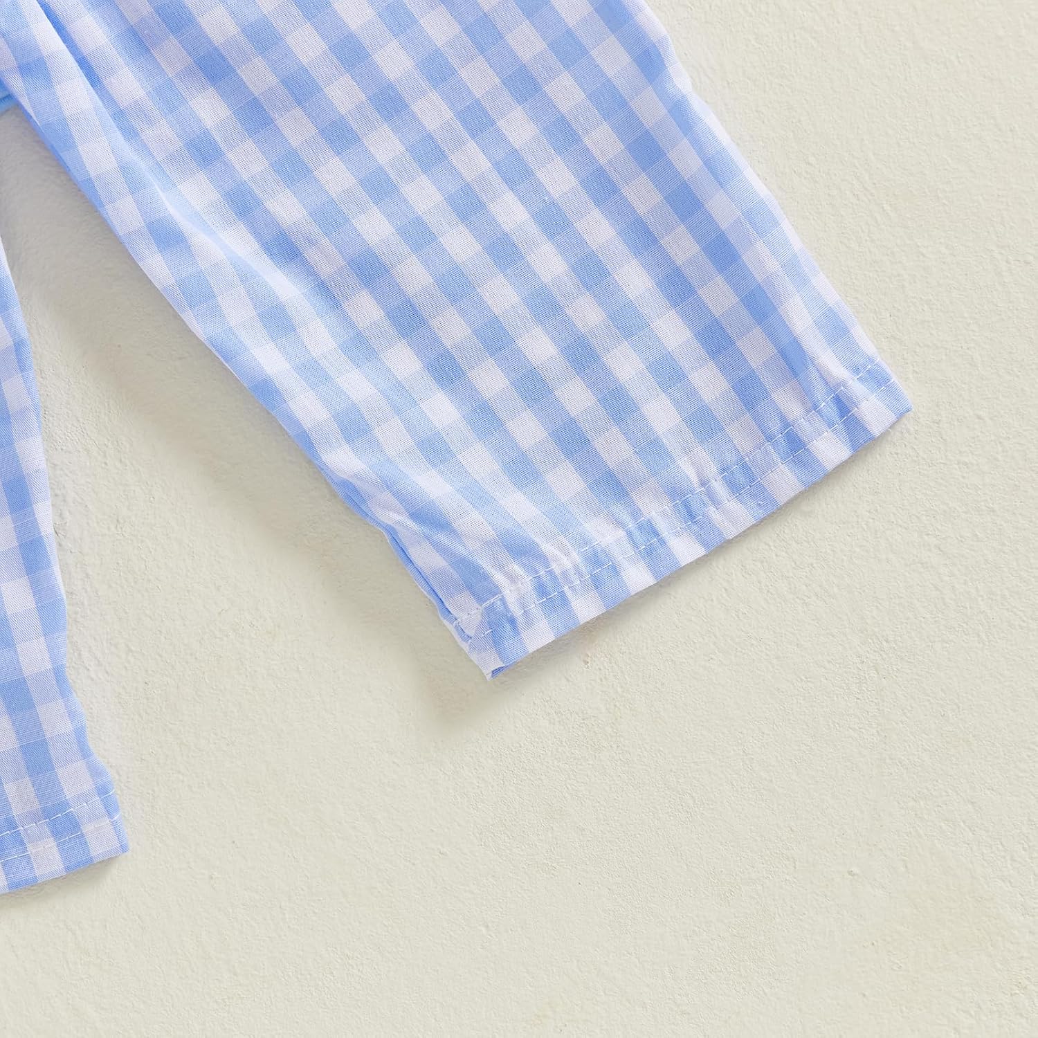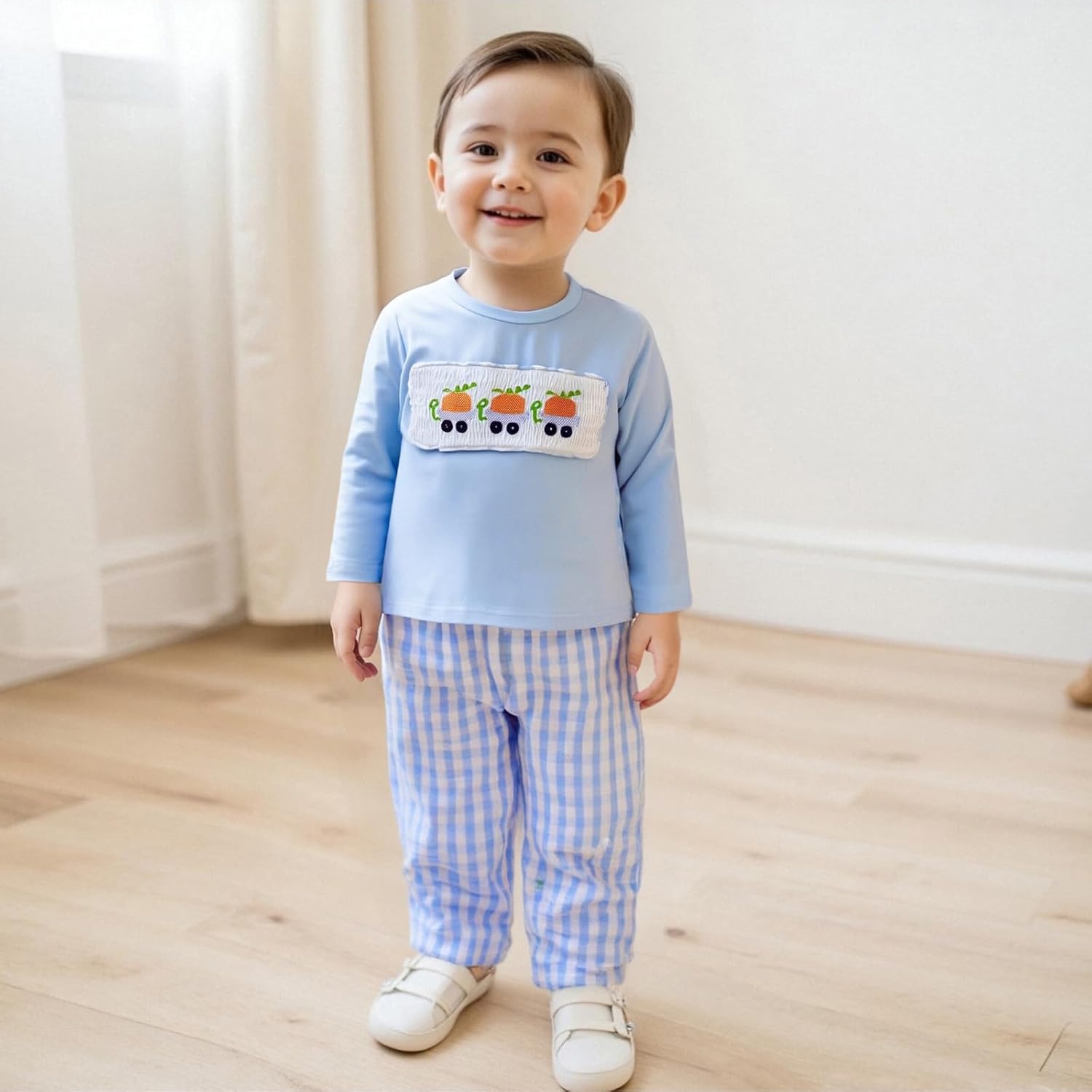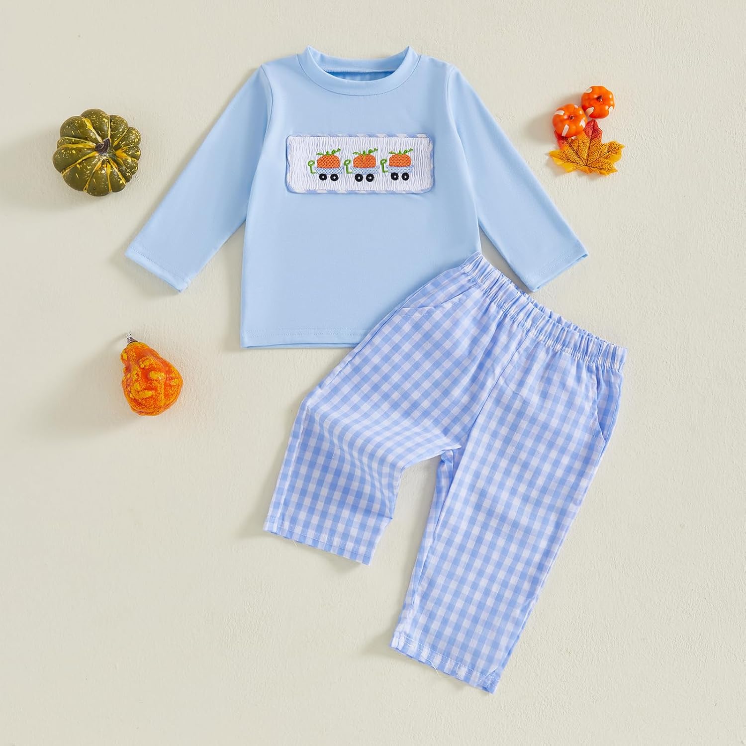 Toddler Baby Boy Halloween Ghost Pumpkin Outfit Long Sleeve Embroidery Tshirt Gingham Pants 2 Piece Smocked Clothes