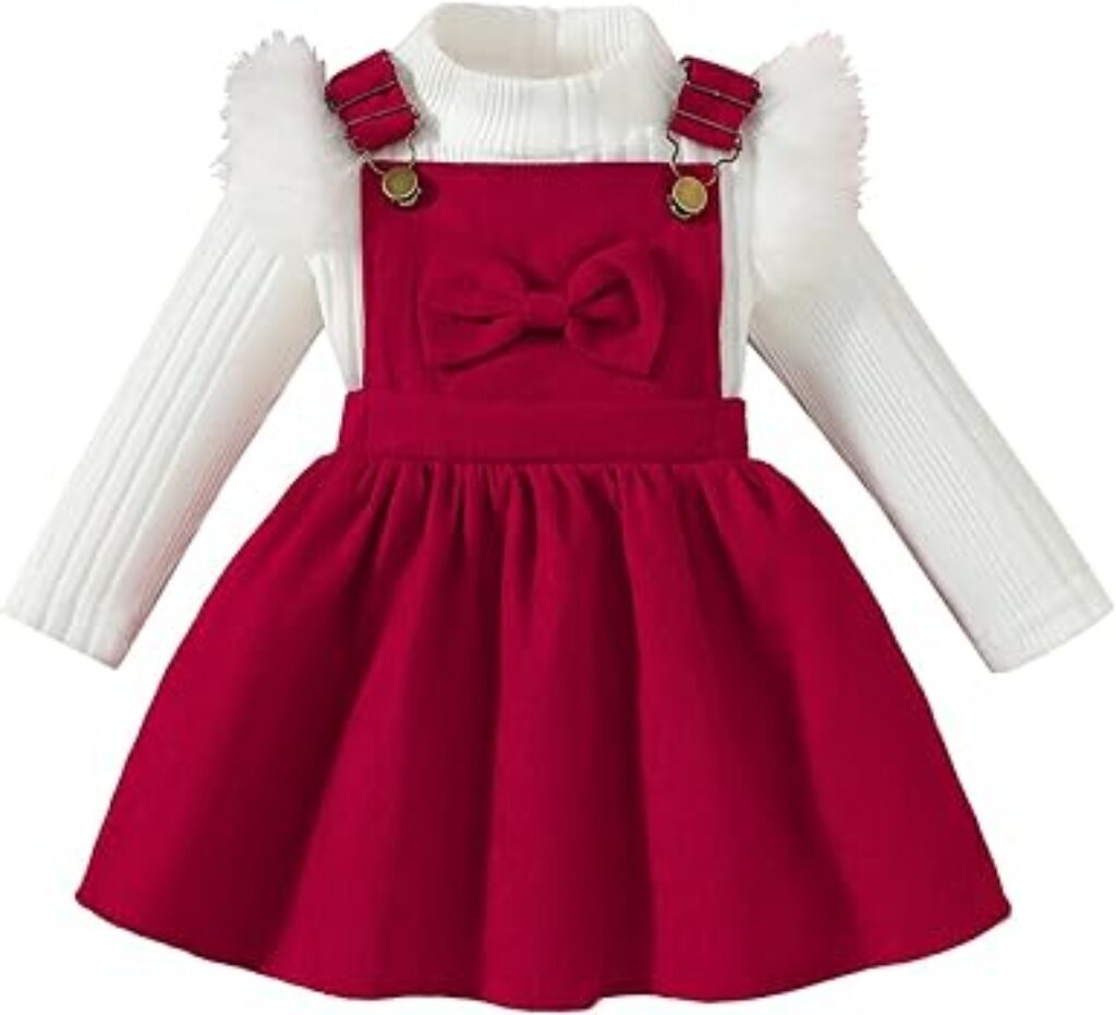 Toddler Baby Girl Outfits Long Sleeve Ribbed T-Shirt Bow Overall Dresses Suspender Skirt Set Fall Winter Clothes