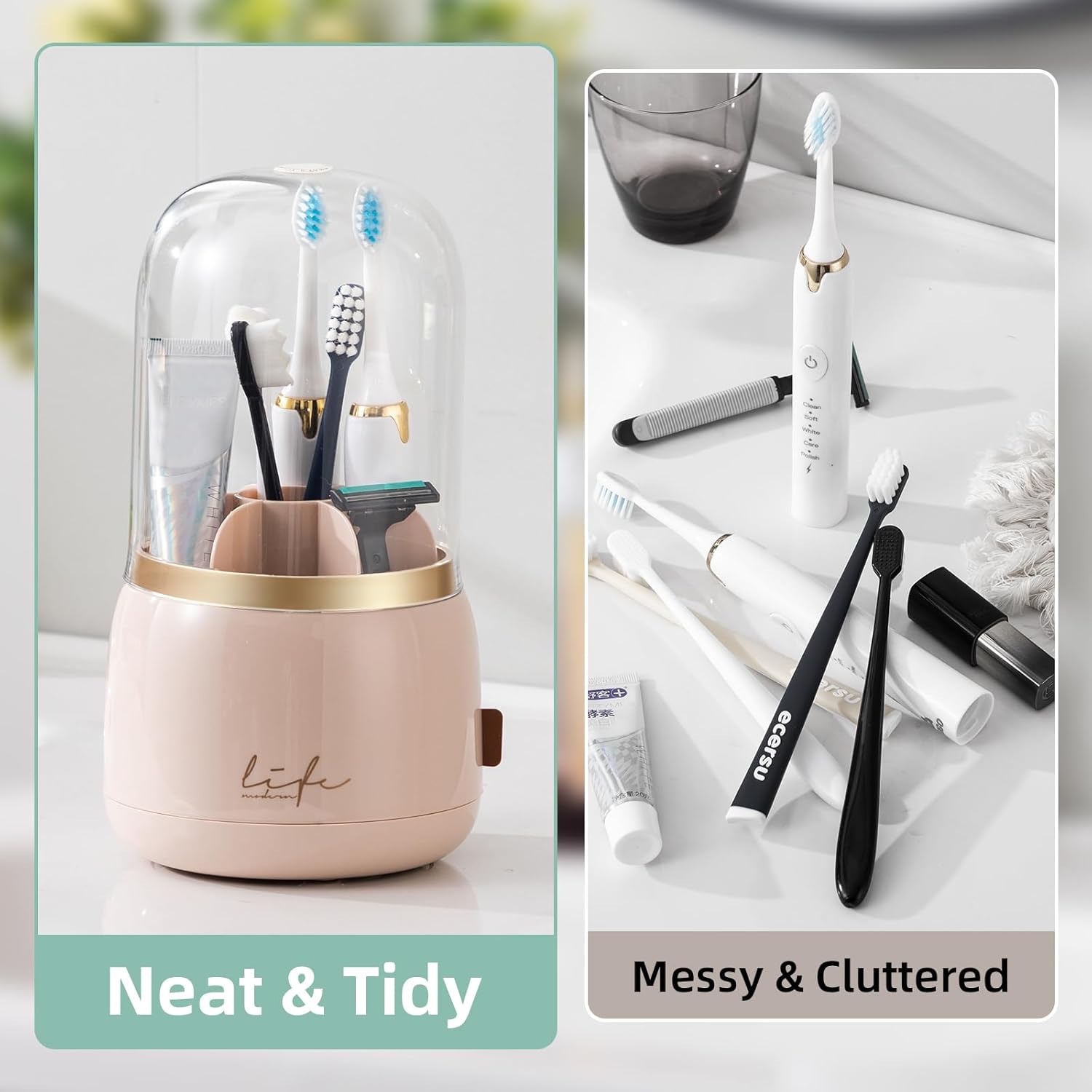 360° Swivel Base: The toothbrush holder can be rotated 360° for easy access to your toothbrush, toothpaste and other items from any angle