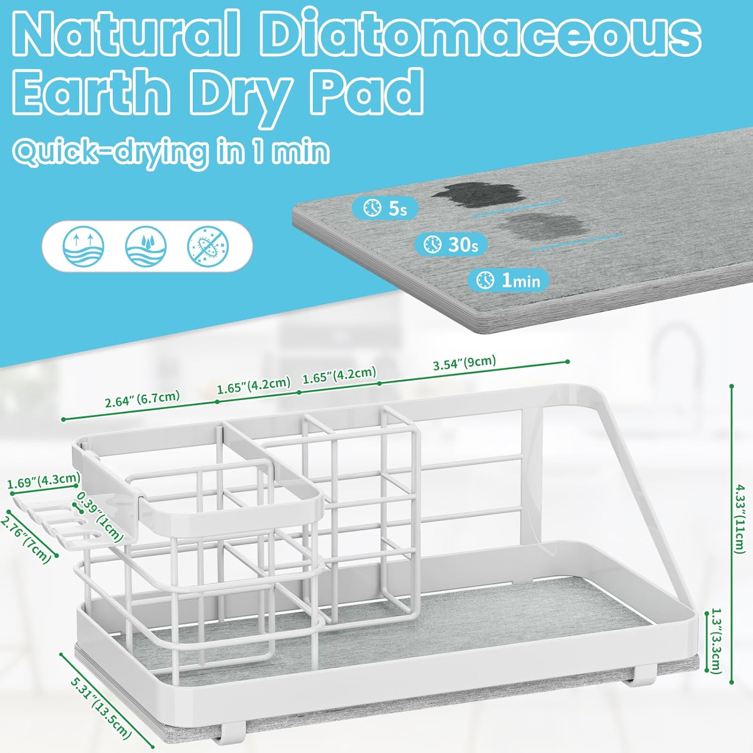 Anti-Slip & Easy to Clean: Bottom of this bathroom organizer has 4 non-slip rubber pads to ensures stability, preventing the holder from sliding or scratches your bathroom countertop.Smooth coated makes it easy to clean.The diatomite stone sink counter organizer can widely applied in the bathroom, kitchen, college dorm, appartments, farmhouse and RV etc. It maximizes space efficiency and keep your bathroom more clean and organized, no more mess