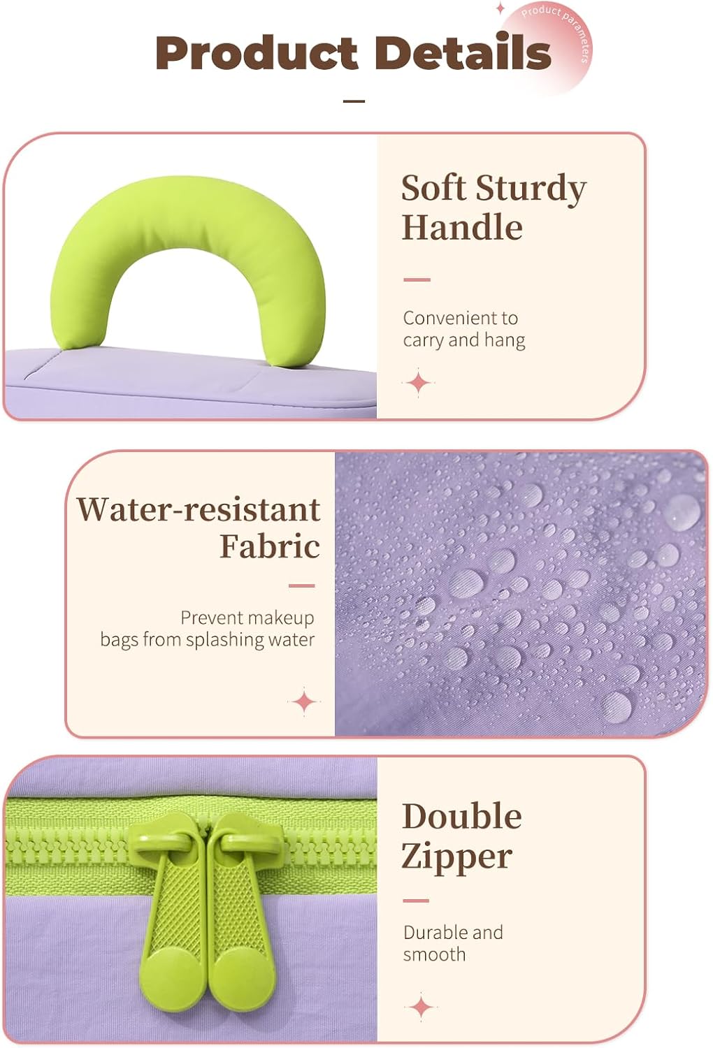 Premium Waterproof Material: Crafted from soft, waterproof fabric with easy-clean durability and a tough polyester lining, this women’s make up bag delivers worry-free luxury that seamlessly safeguards your beauty essentials. The transparent waterproof compartment keeps makeup brushes visible and neat, all while maintaining a wrinkle-resistant, scratch-proof finish with a sturdy yet soft carry handle for graceful portability.