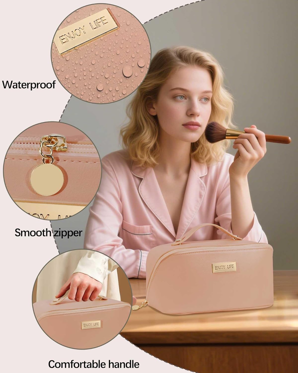 【PREMIUM WATERPROOF & DURABLE MATERIAL】Crafted from high-quality, easy-to-clean PU leather and a robust water-resistant lining, this travel makeup bag is built to last. It reliably protects your valuable cosmetics from accidental spills, splashes, and stains. Simply wipe clean with a damp cloth, and it looks as good as new, ready for your next adventure