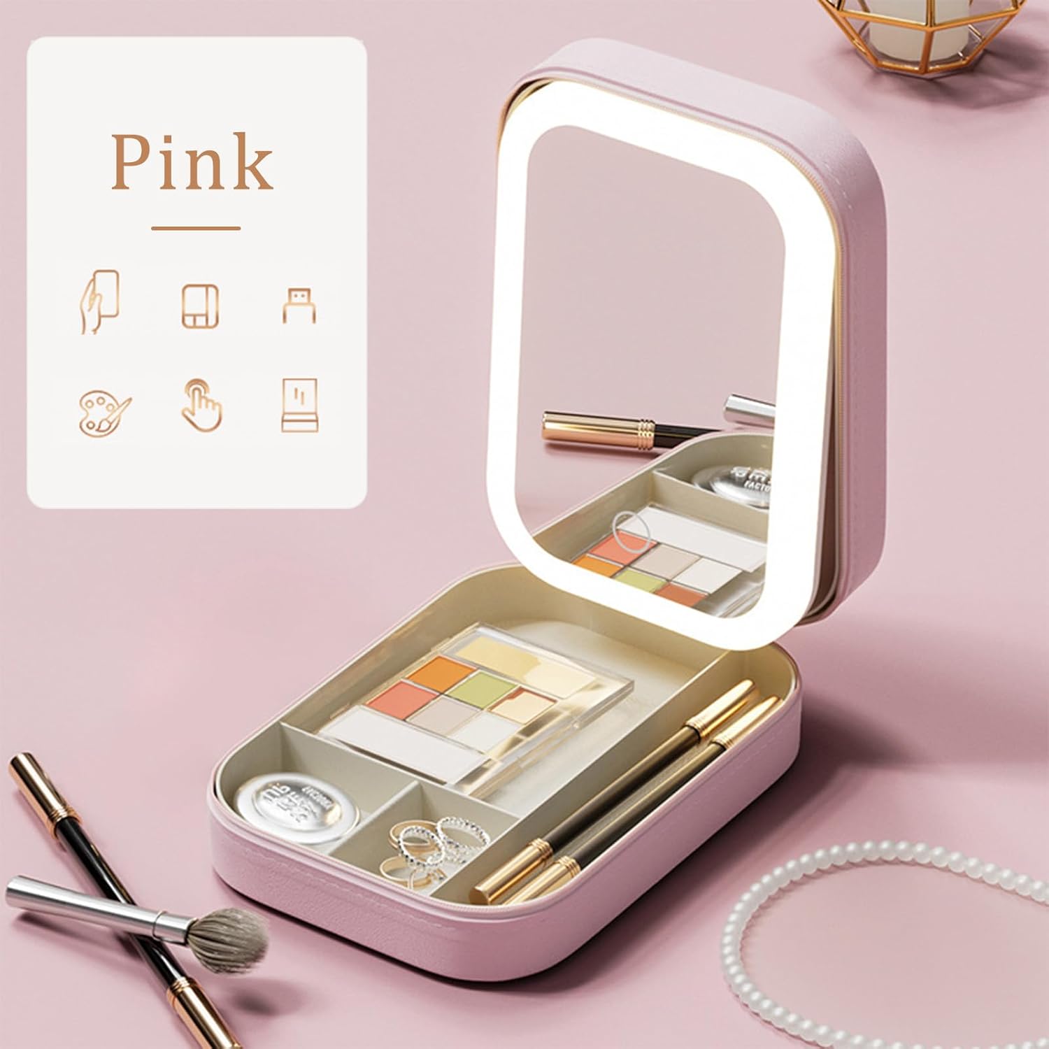 Travel Makeup Case with LED Mirror, Makeup Bag with Lighted Mirror, Cosmetic Storage Box, Christmas Portable Organizer Vanity Case for Women, Beauty Tool Accessories Rechargeable, Pink