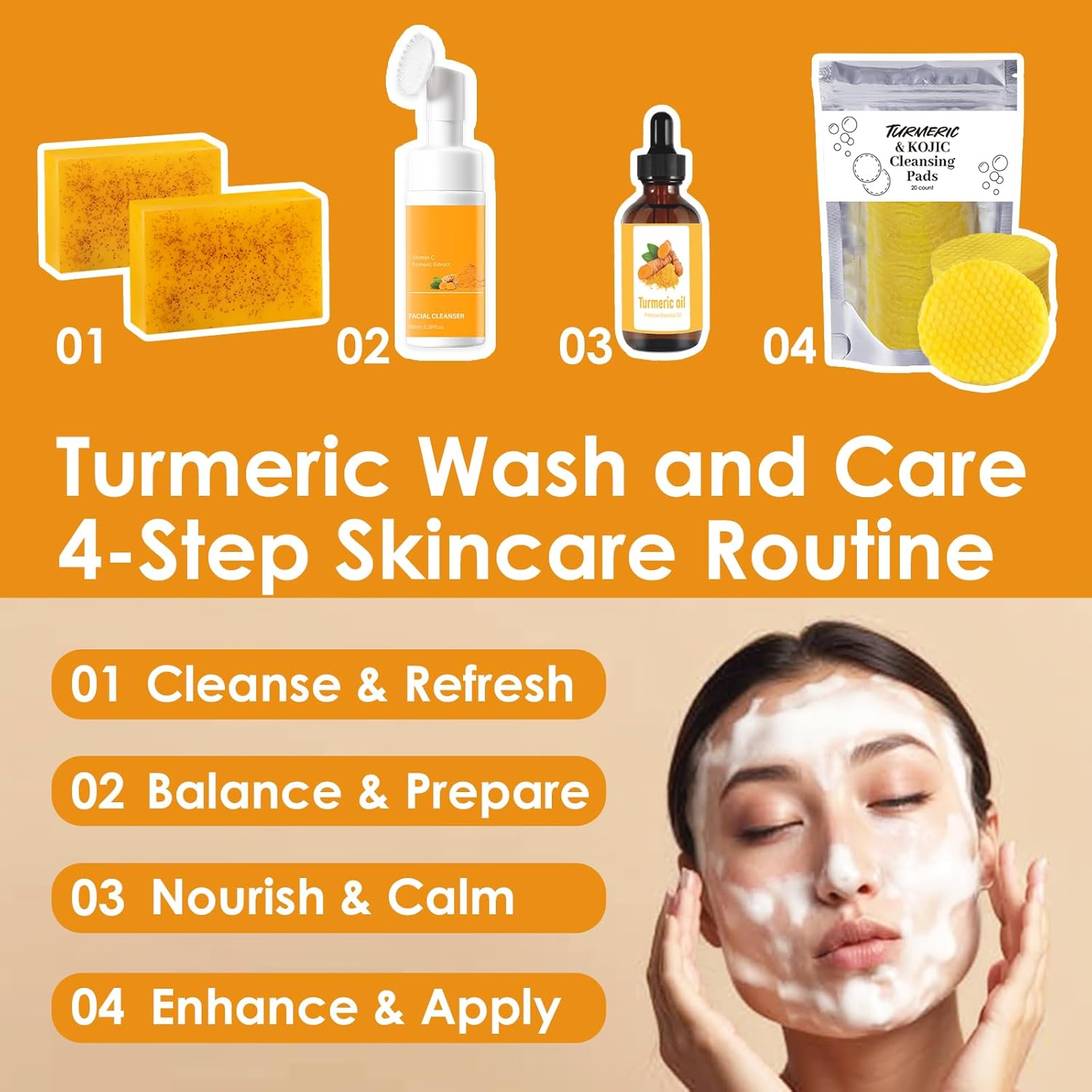 【Turmeric Skincare Set – Complete 4-Step Daily Routine】 Begin with the turmeric soap bar to gently cleanse and lift away daily buildup (Step 1). Follow with the soft-brush foaming cleanser to refresh and rebalance the skin (Step 2). Next, apply the turmeric facial oil to deeply nourish and calm (Step 3). Complete your ritual with exfoliating cotton pads to improve product absorption and leave skin feeling smooth (Step 4). Each product works in synergy to support a naturally clear, calm, and healthy-looking complexion.