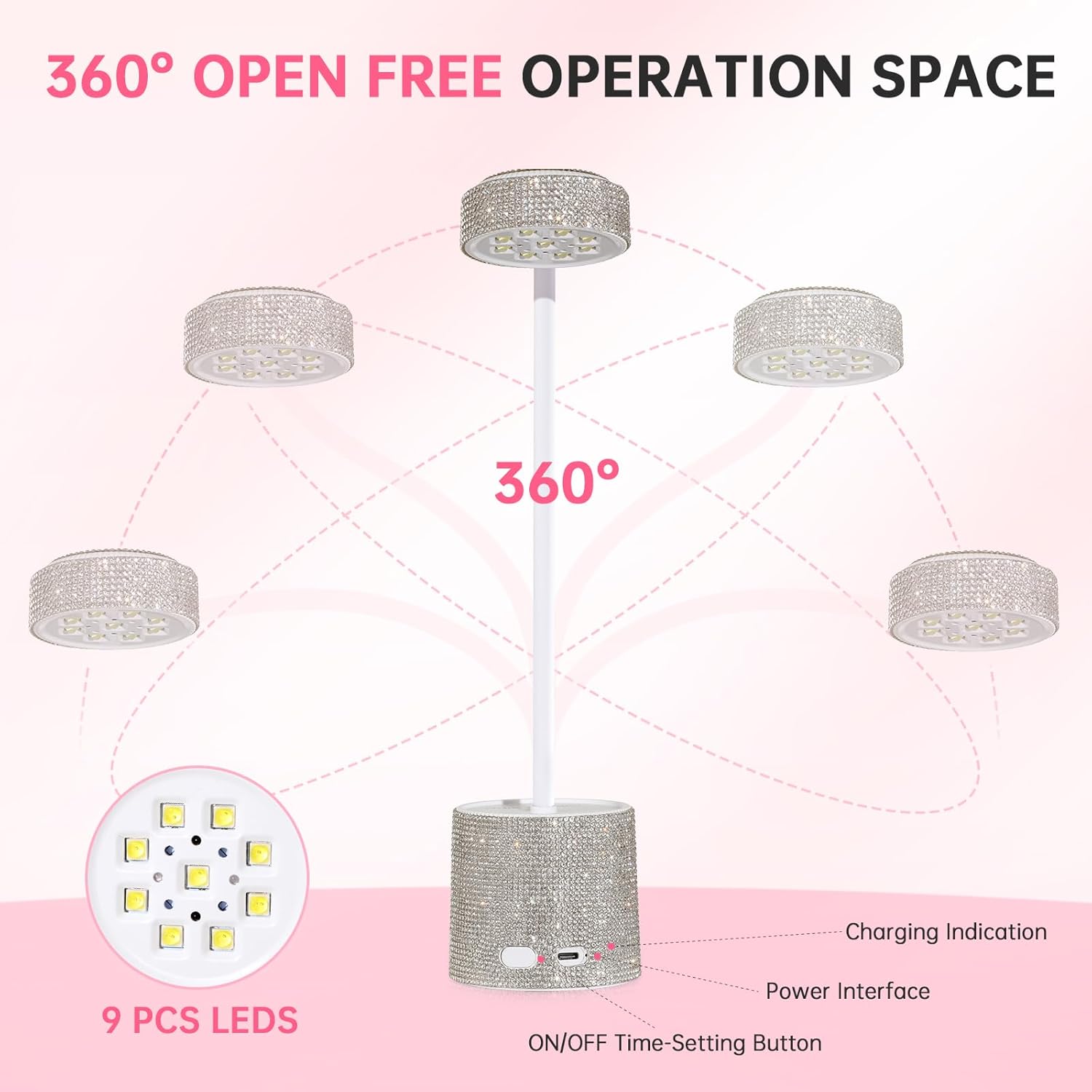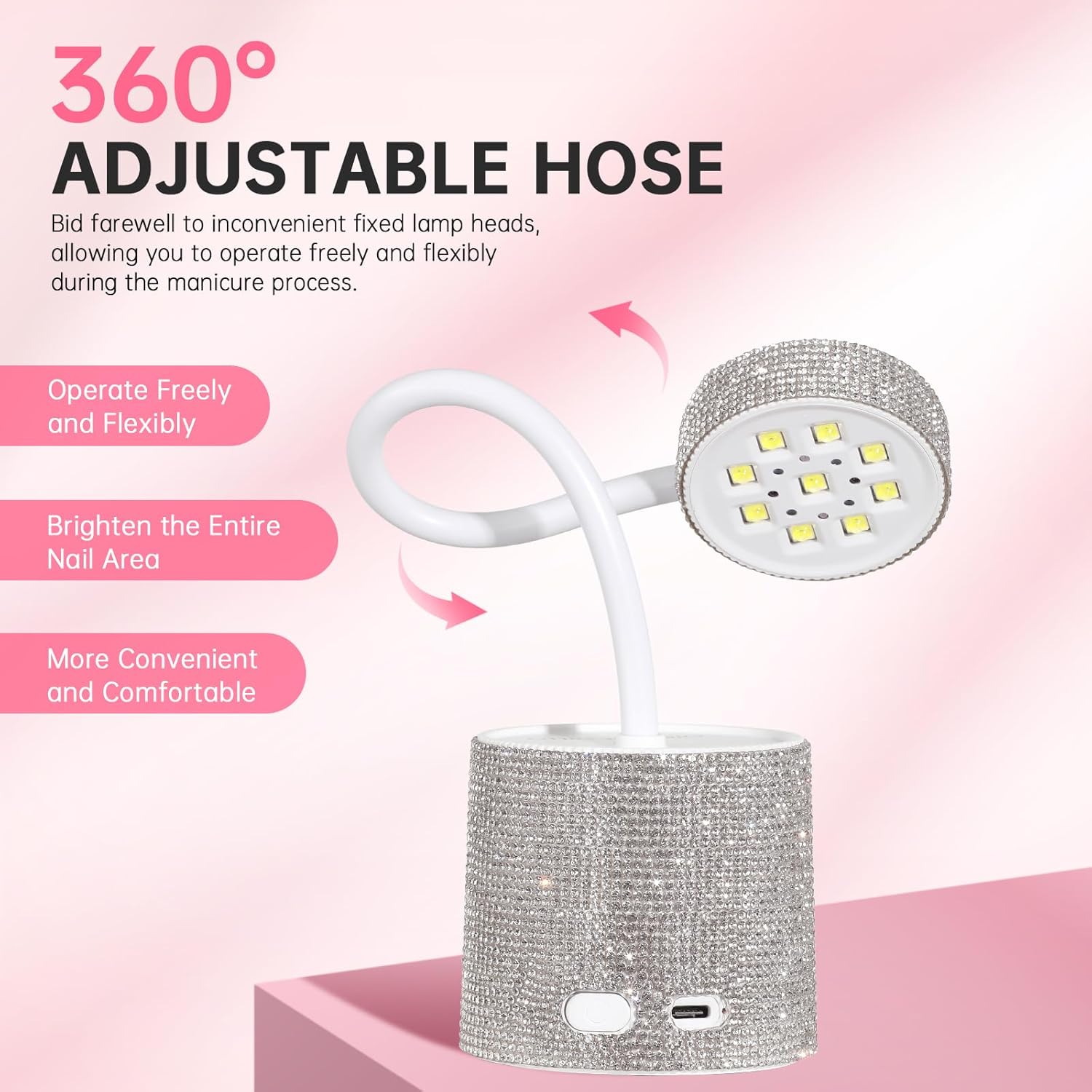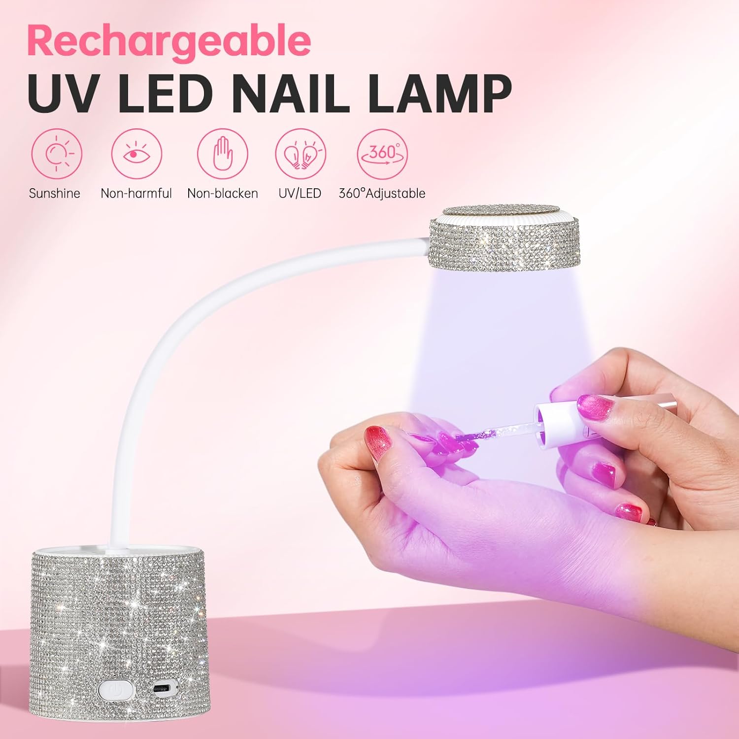 Diamond Surface and USB Wireless Design: This gooseneck portable nail curing lamp adopts an eye-catching diamond surface design, and the hand-set diamonds make its surface sparkling and amazing. The wireless design frees you from the trouble of facing complicated wires, supports USB charging, can be used for a long time after charging, easy to carry, can provide you with sufficient light source anytime and anywhere, wireless, small space occupation, flexible storage.
