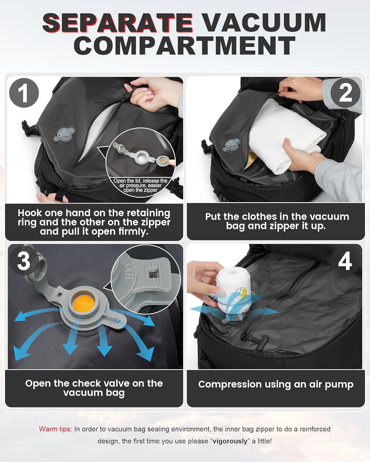 Multifunctional Backpack:This vacuum seal backpack is perfect for weekender, travel, business, college, hiking, camping, daily use and other outdoor activities.Perfect gift for men, women, office workers, travelers.
