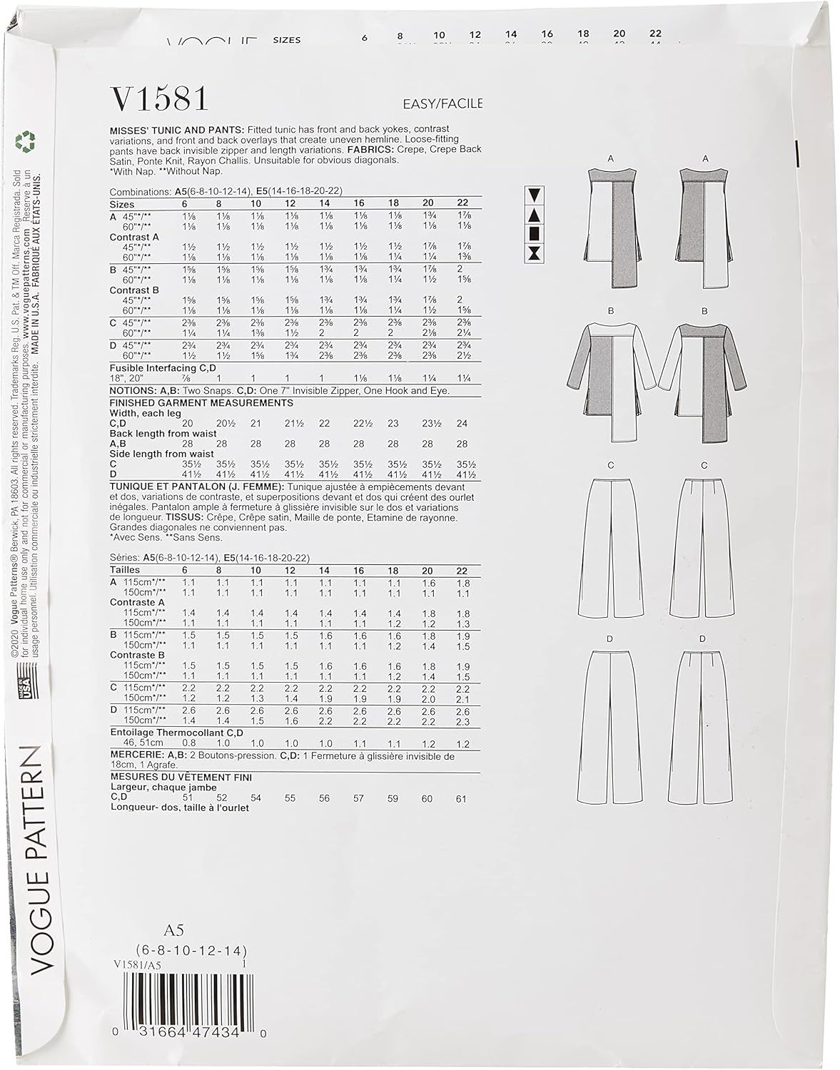 Fitted tunic has front and back yokes, contrast variations, and uneven hemline. Loose fitting pants have back invisible zipper and length variations. Crepe, Crepe back satin, Ponte knit, rayon Challis. Note: fabric requirement allows for Nap, one-way design or shading. Extra fabric may be needed to match design or for shrinkage.