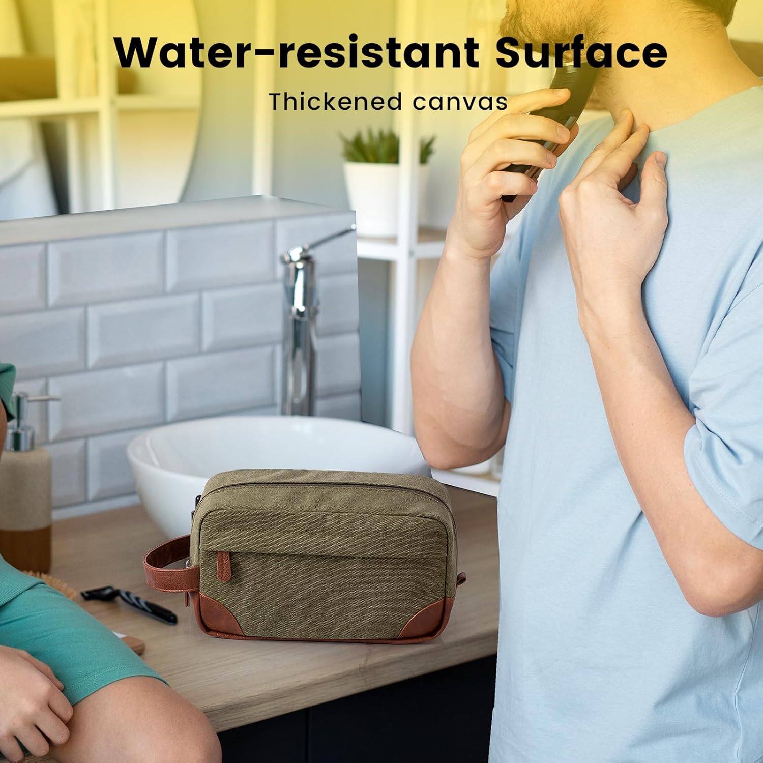 Quality & water-resistant material: The toiletry travel bag is made of sturdy & wearable canvas material that has no unpleasant smell. The canvas and PU leather make the bag itself very well-constructed to keep the shape and protect your toiletries from splashed water