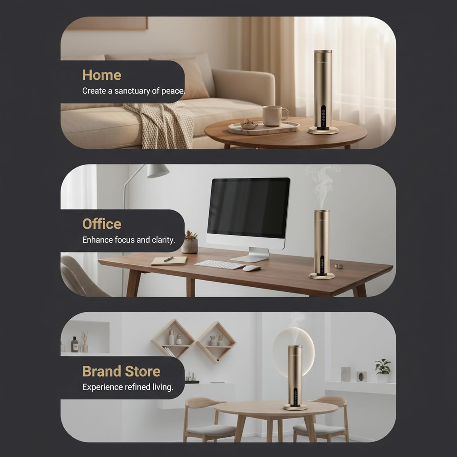 🌟 Transform Your Space into a Personal Oasis The AROMALEV Tower Diffuser is a revolutionary waterless aromatherapy device that blends cutting-edge technology with elegant design. Unlike traditional diffusers, its heat-free technology preserves the full benefits of essential oils—no water needed, ensuring a pure and powerful fragrance experience. 📱 Smart & Convenient Control Take full control with two options: ✔️ A sleek touch-sensitive panel ✔️ Bluetooth connectivity to a user-friendly app, allowing you to adjust settings, schedule sessions, and personalize your aromatherapy experience from your smartphone. 🔋 Long-Lasting Battery Life Enjoy wireless freedom with an impressive battery life: a 3.5-hour charge provides up to 8 days of operation. No power cords, no hassle—perfect for home or office use. 🏡 Powerful Coverage for Large Spaces Designed for maximum diffusion, this device effectively scents areas up to 1200 sq.ft—ideal for large rooms, open-plan spaces, and offices. 🌱 Eco-Friendly & Safe for Everyone Our waterless technology ensures the purest fragrance diffusion without dilution, making it a great choice for aromatherapy lovers, professionals, and anyone seeking a refined ambiance. Child & pet-safe, perfect for any lifestyle. ✨ Key Features: ✔️ Waterless & Heat-Free Technology ✔️ Smart Bluetooth App Control ✔️ Touch-Sensitive Panel ✔️ 8-Day Battery Life ✔️ 1200 sq.ft Coverage ✔️ Eco-Friendly & Portable ✔️ Child & Pet Safe