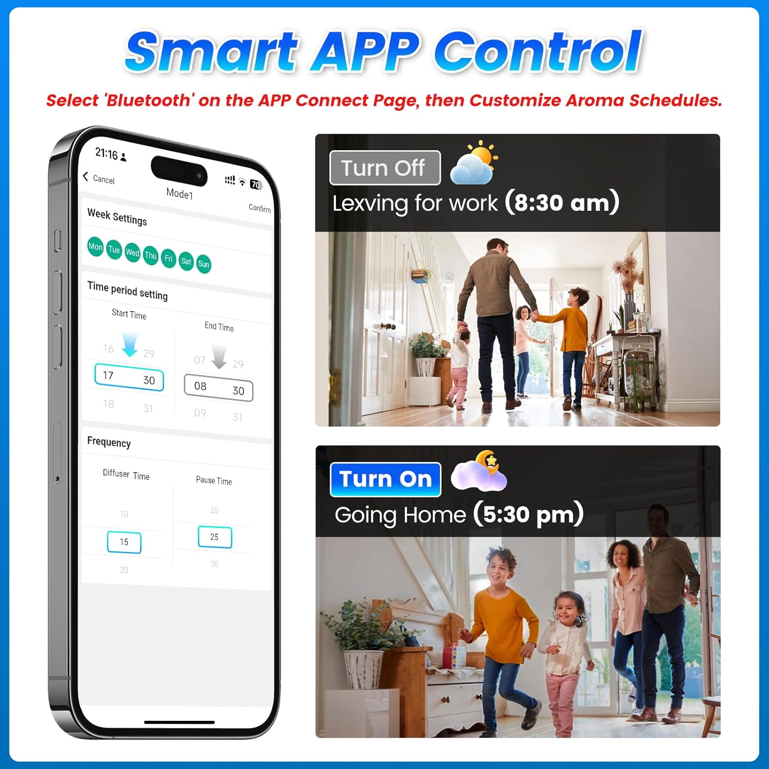 (2) – APP recommended if you need flexibility or more comstize plan,Programming linclued: Week Schedule,Time Period, Diffuser Frequency Setting.