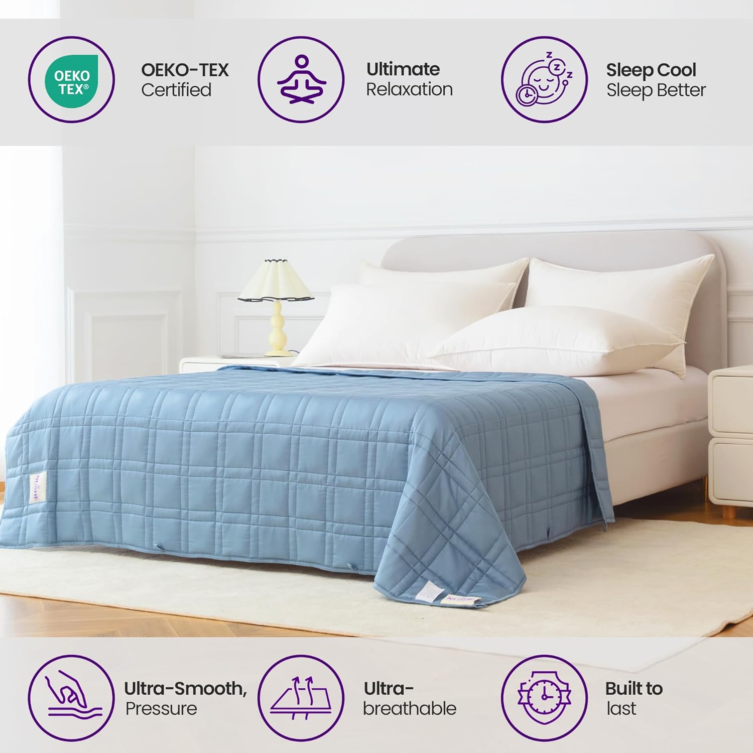 NUSHE cooling weighted blanket provides a balanced and cozy feel with breathable viscose derived from bamboo and evenly distributed glass beads for a smooth premium experience