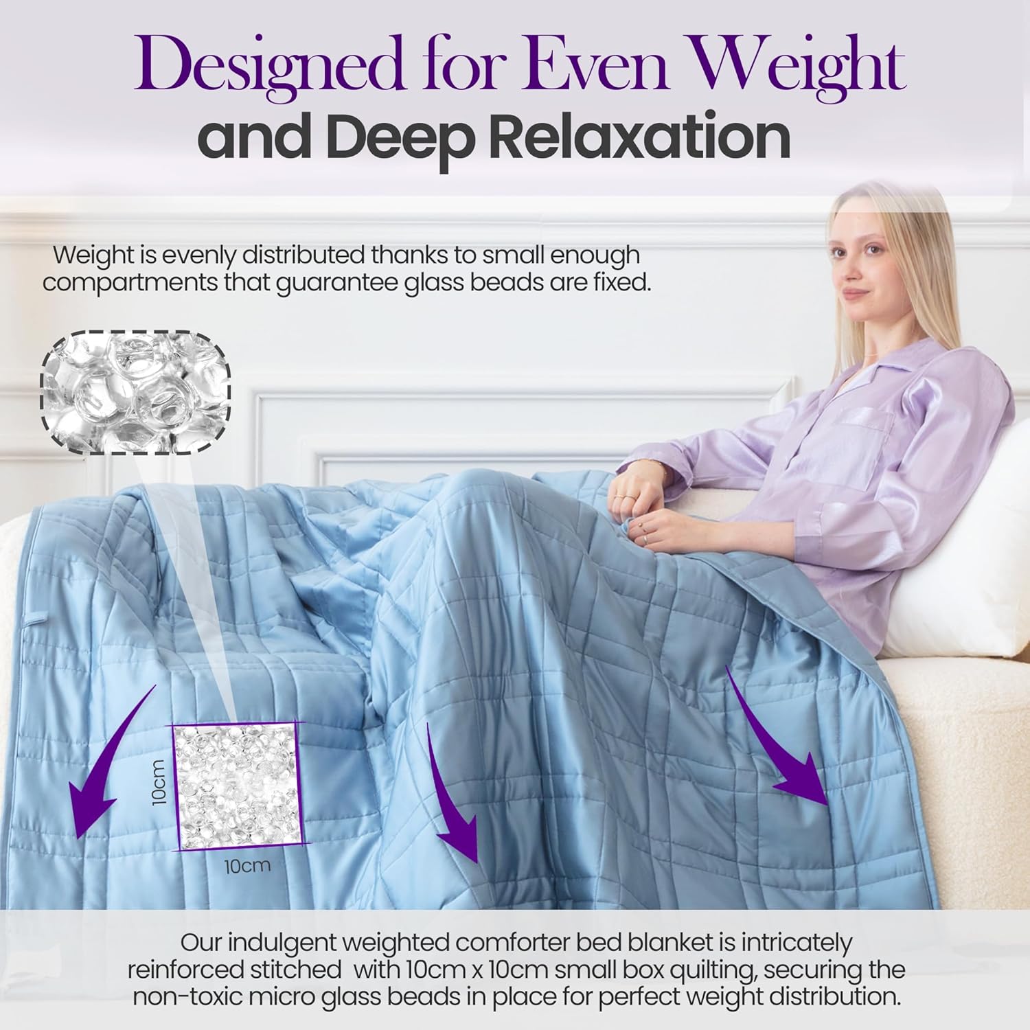 Small box stitching keeps the beads secure for even weight distribution giving this weighted cooling blanket reliable comfort and consistent support