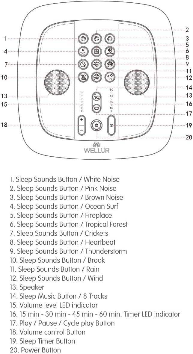 WELLUR – Stereo Sound White Noise and Natural Sound Sleep Machine with Relaxing Spa Music. For enhanced sleep, relaxed atmosphere and increased focus. Soothes infant and parents, improves concentration, creates confidential conversation and blocks inside or outside undesirable noise. For: Home, Office, Dorm, Kids Room, Spa or Nursery.