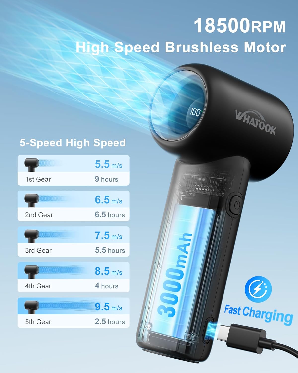 Power and battery:small personal fans built-in 3000mAh rechargeable Battery.Max. speed: 9.9 m/s.6-9 hours of high airflow experience.2A fast charging, no waiting needed.