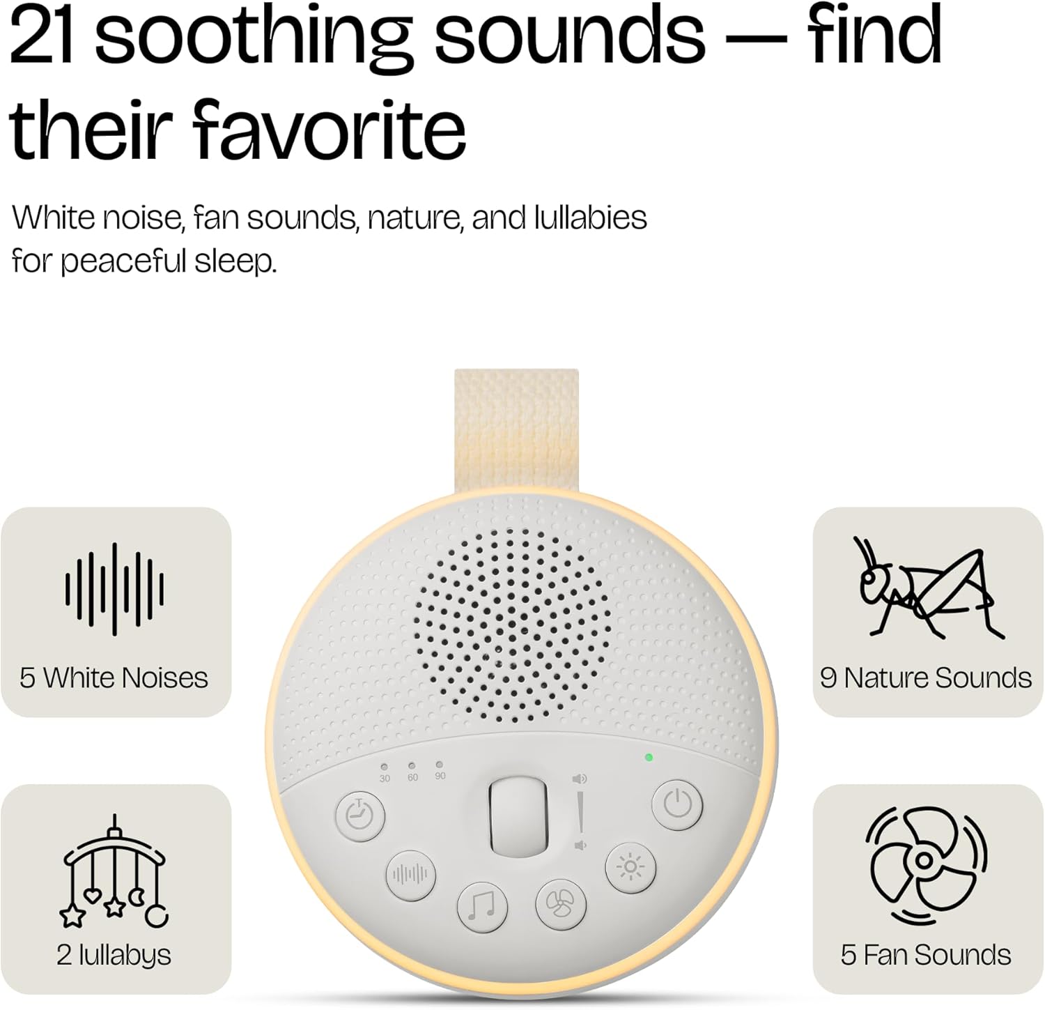 21 Relaxing Sound Options: Offers white noise, nature sounds, and fan sounds to help adults achieve a peaceful night’s sleep.