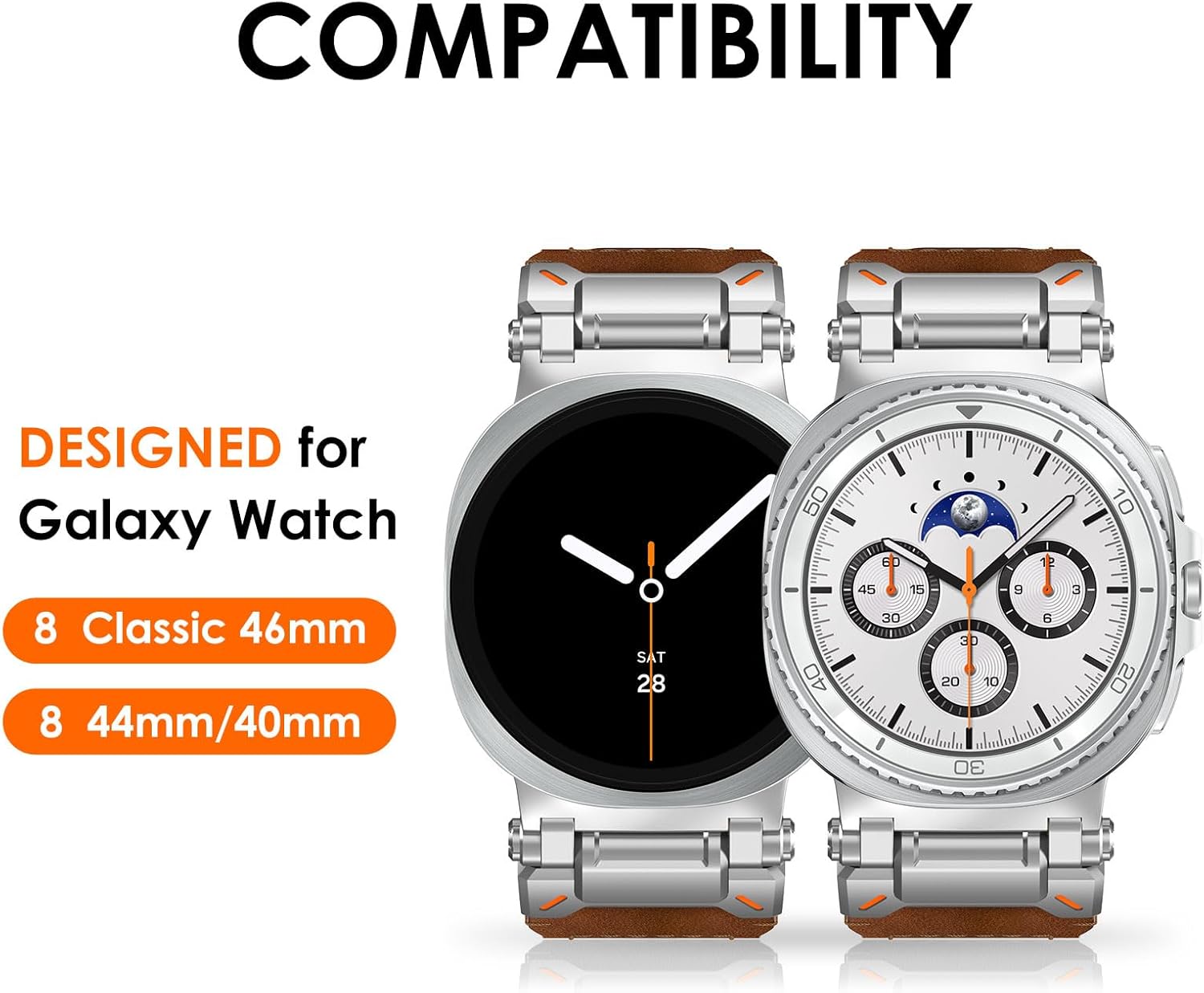 [Unique Rugged Design]: Wingle Leather Samsung Galaxy Watch 8/ 8 Classic Bands with metal connector. Mecha element stainless steel connectors and 26mm width design, unlike the regular leather strap, give your galaxy watch 8 Classic 46mm more rugged look and feelings. Two joints of metal connector and the connection of metal connector with silicone strap are bendable to fit wrist better.