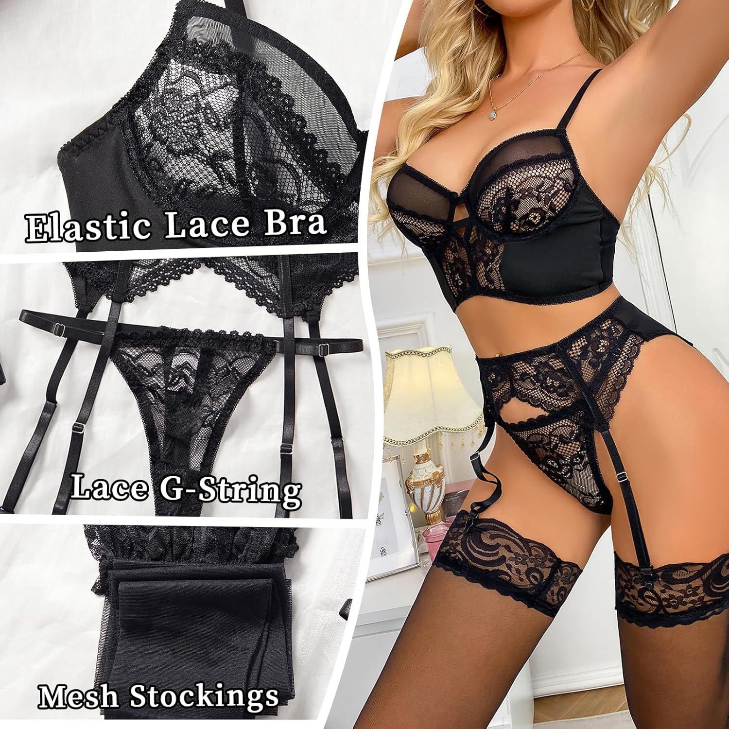 Women’s Sexy Lingerie with Waist Garter Embroidered Lace Flower Bra and G-String 4 Piece Lingerie Sets