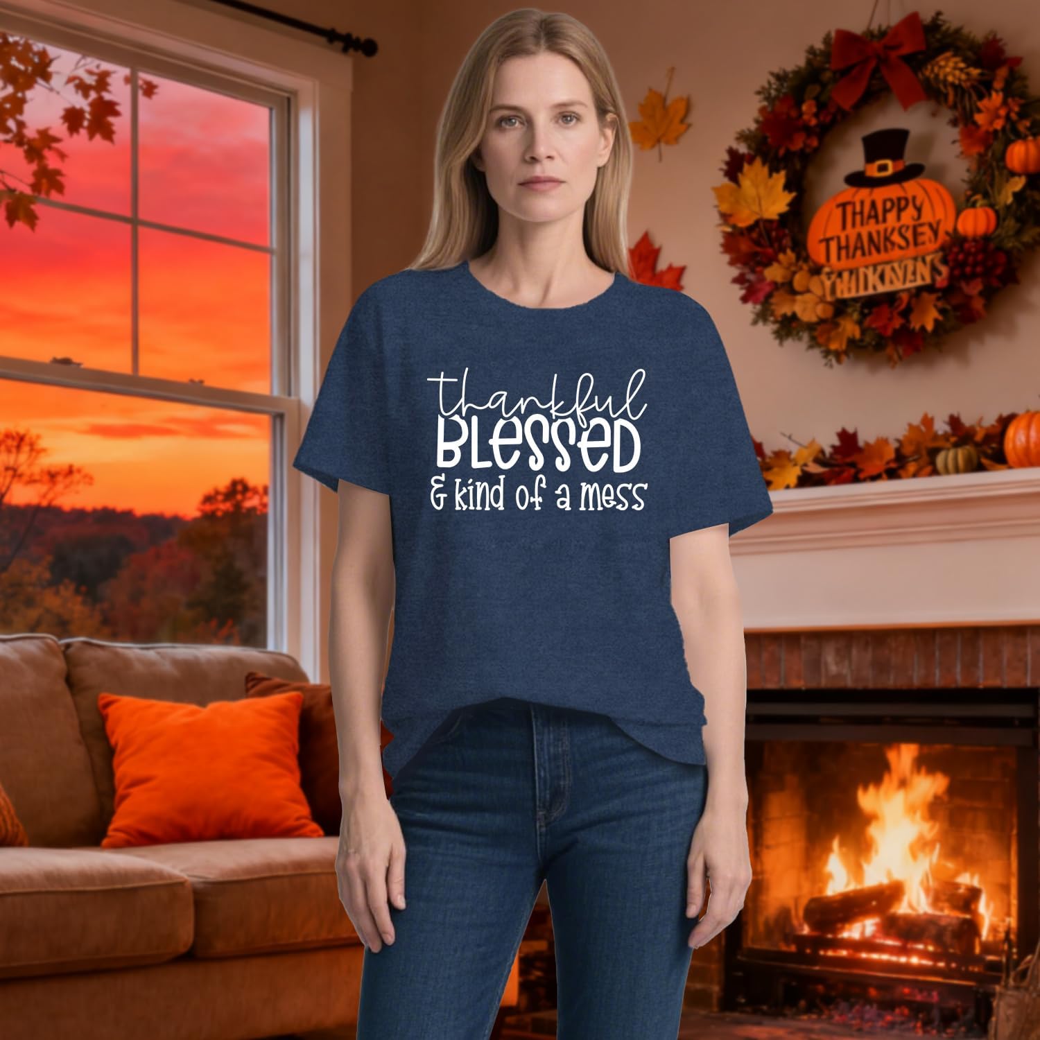 Womens Thanksgiving Shirt Thankful Blessed & Kind of a Mess T-Shirt Christian Faith Tee