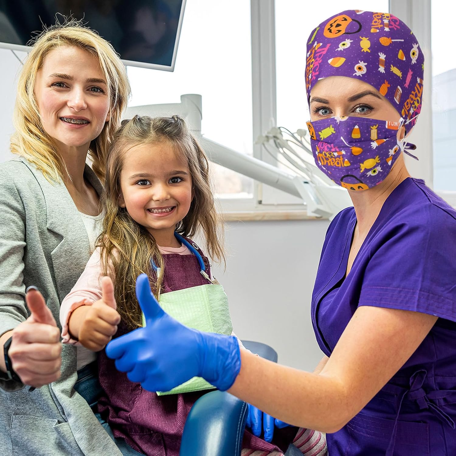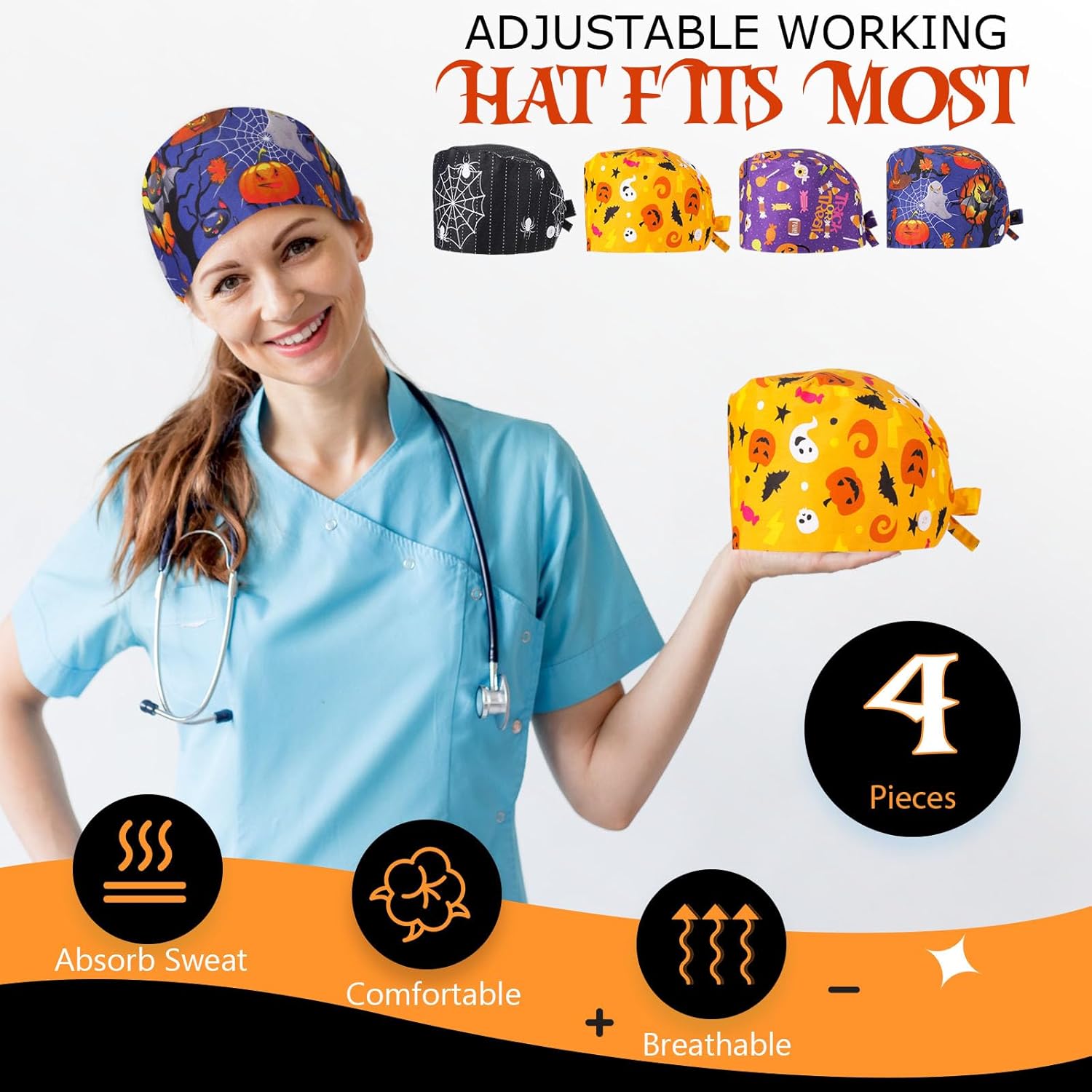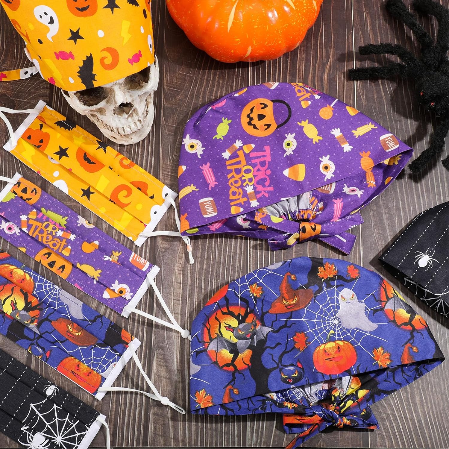Xtinmee 8 Pcs Halloween Scrub Caps and Halloween Face Mask Halloween Doctor Nurse Adjustable Bouffant Working Cap Scrub Hats with Halloween Ghost Pumpkin Bat Candy Spider Printed Face Cover for Adults