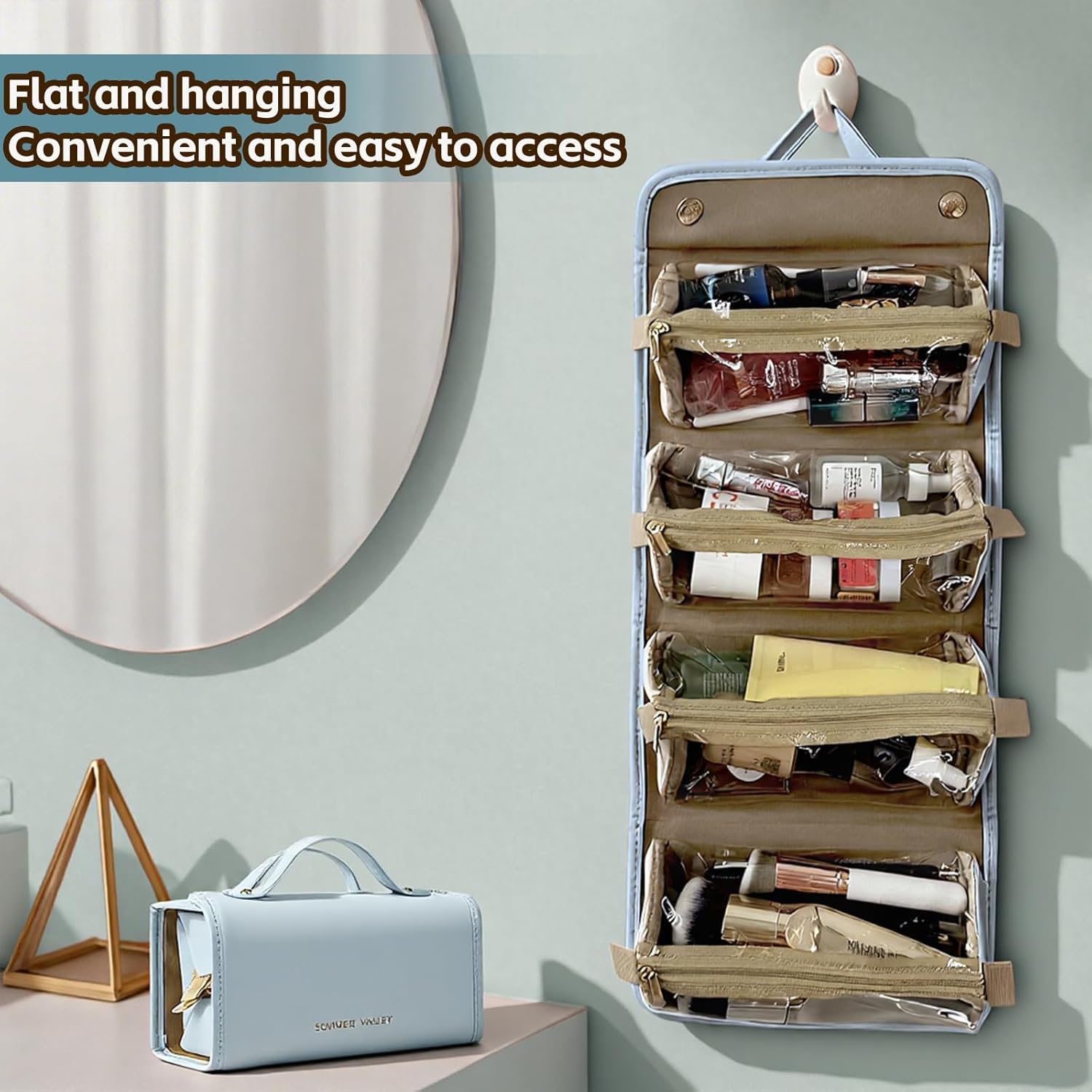 /Easier Access Bag/:The travel makeup bag features an innovative 180-degree opening for the ultimate in convenience. Effortlessly access all your makeup essentials in an instant. -When you’re ready to leave, cosmetic travel bag can be quickly tucked away again.